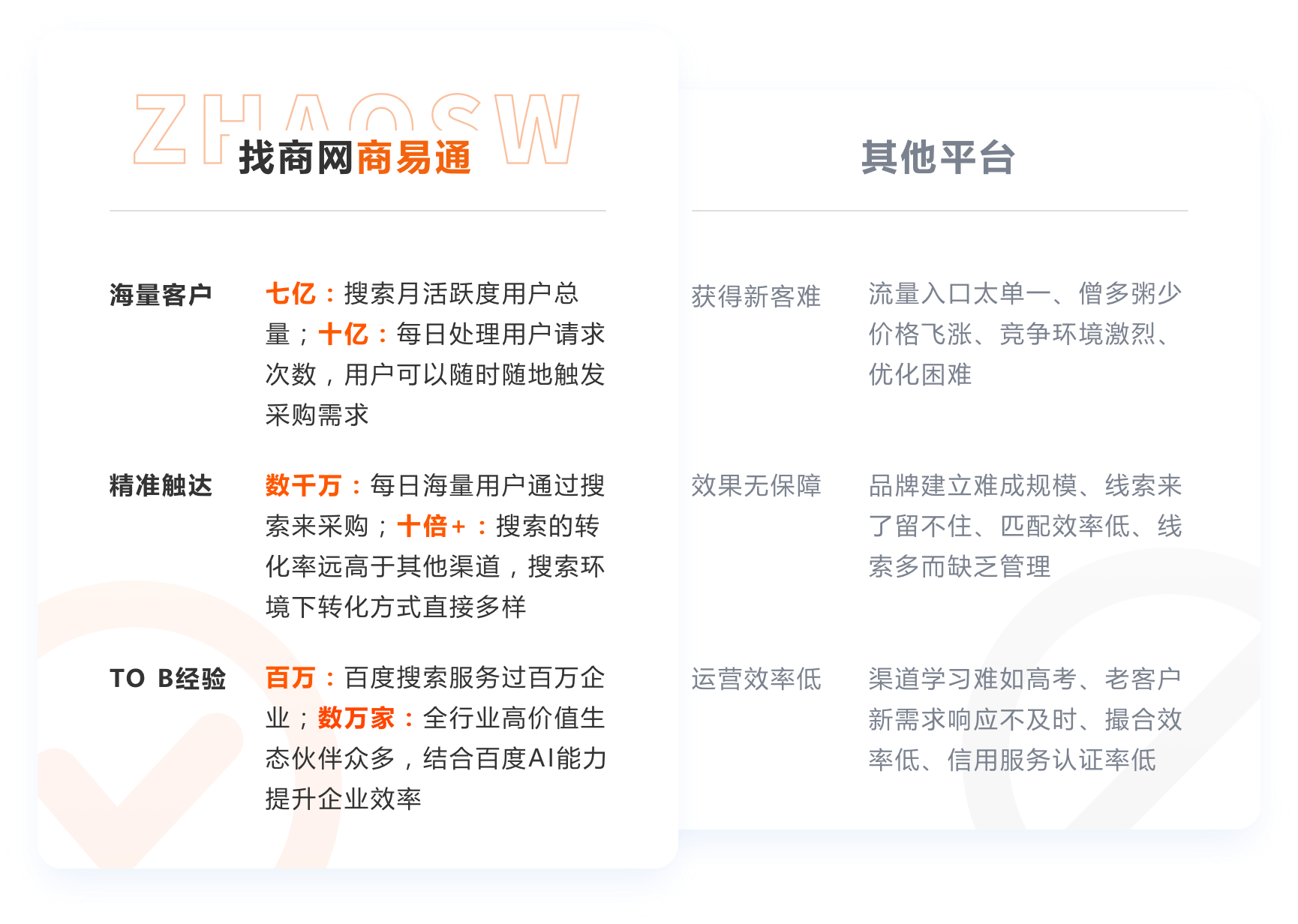 【找商網(wǎng)】 (www.zhaosw.com) 隸屬于杭州云搜網(wǎng)絡(luò)技術(shù)有限公司旗下產(chǎn)品,2019年初聯(lián)合百度愛采購平臺(tái)攜手打造B2B行業(yè)新的生態(tài)圈,重磅推出B2B新營銷云武器——“商易通”、“易銷車”、“采優(yōu)寶”等服務(wù)項(xiàng)目,為中小企業(yè)提供從品牌、建站、流量、運(yùn)營、認(rèn)證全鏈路打通的一站式B2B電商解決方案,賦能助力中小企業(yè)發(fā)展。上線僅不足6個(gè)月,【找商網(wǎng)】平臺(tái)就吸引了大批商家入駐,迅速在B2B市場站穩(wěn)腳跟。2019年入駐【找商網(wǎng)】平臺(tái)的客戶數(shù)量突破10000家,成為百度愛采購近20家TP合作伙伴中首家突破萬單會(huì)員數(shù)量的服務(wù)商。截止2022年9月,找商網(wǎng)付費(fèi)會(huì)員數(shù)量已達(dá)43816家,成為百度愛采購會(huì)員體量中最大的TP服務(wù)商,商鋪行業(yè)品類已全面覆蓋“工業(yè)制造、農(nóng)業(yè)生產(chǎn)、商業(yè)貿(mào)易、辦公批發(fā)”等30+主行業(yè)、873個(gè)細(xì)分行業(yè),商品數(shù)據(jù)高達(dá)5億+。